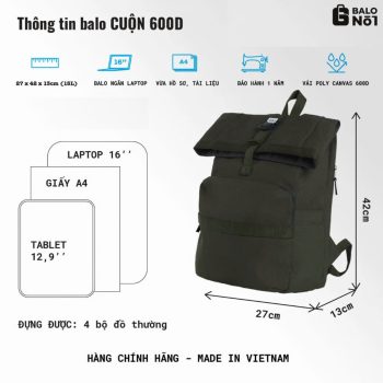 Balo Đậm Cuộn 600D sử dụng chất liệu vải polyester 600D trượt nước rất tốt | Lót cotton pha | Đai poly | Khóa móc G; tăng kim loại chắc chắn, tiện lợi, bền bỉ theo thời gian
