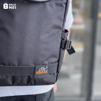 Mặt trước balo đính logo biểu tượng thương hiệu Kmore trên nền Hypalon.