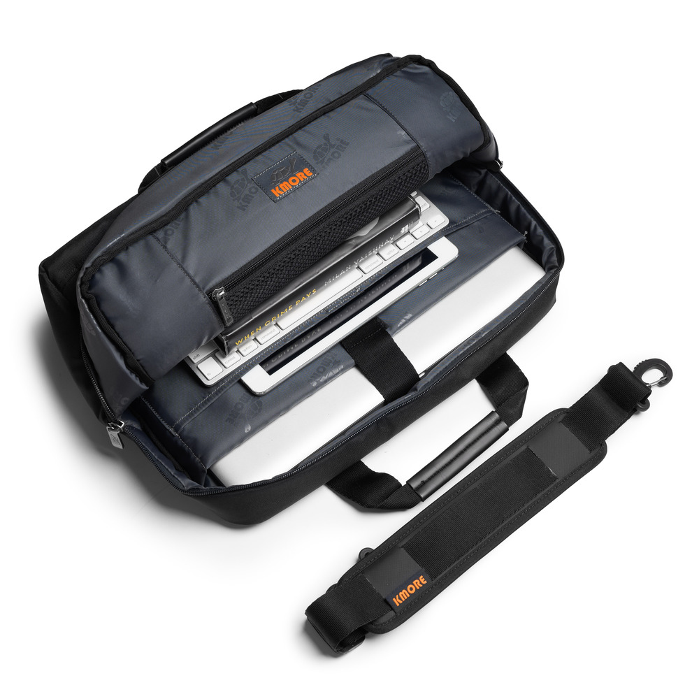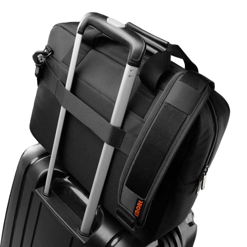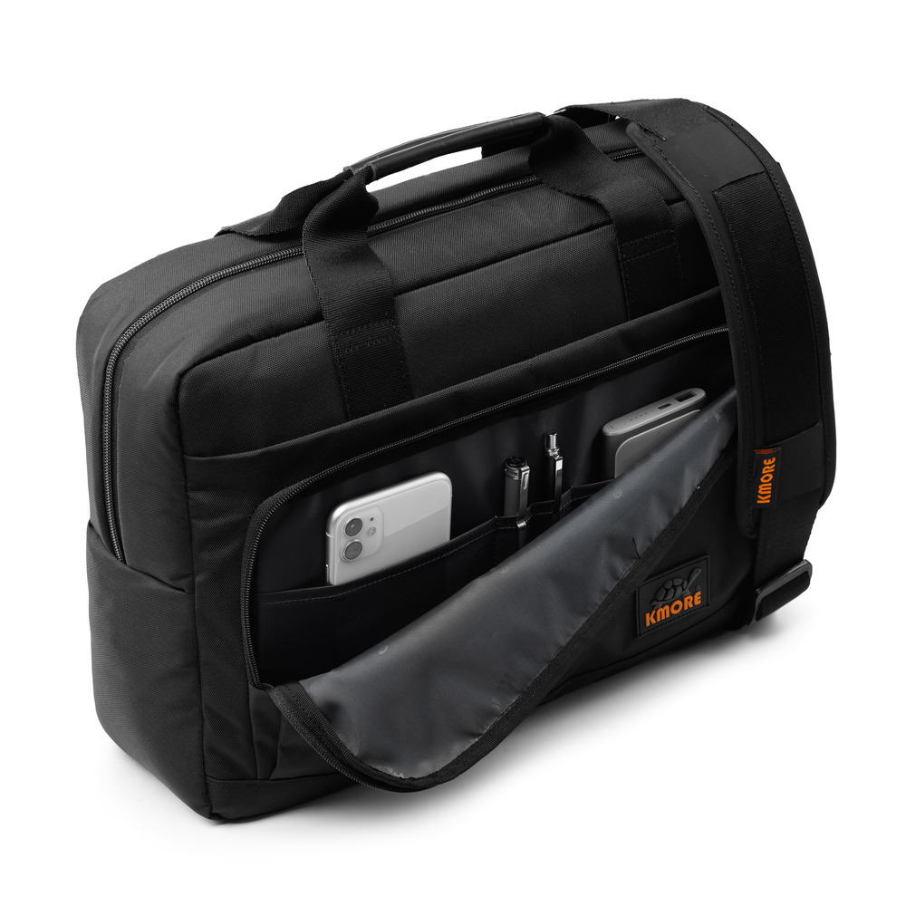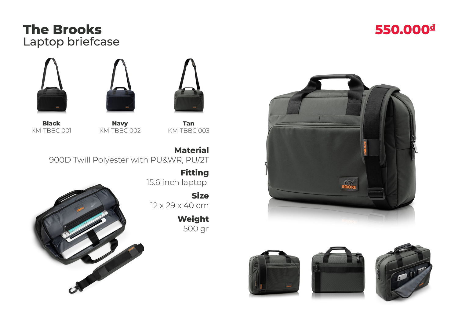 The Brooks Briefcase với 3 màu chủ đạo Black, Navy, Tan được thiết kế đặc sắc trên nền vải 900D Twill Polyester with PU&WR , PU/2T, chống thấm, bền màu cùng logo thương hiệu Kmore độc đáo