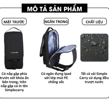 Sản phẩm có 1 ngăn chính, 3 ngăn phụ. Mặt trước có nắp gập với khóa ẩn bên trong, trên nắp gập có in tên thương hiệu Simplecarry. Ngăn trong vuông rộng, đùng dể bút, vở, điện thoại, bên cạnh đó còn có ngăn đựng Ipad với lớp mút PE chống sốc. Phần lưng có lớp lưới Air Mesh thoát hơi nhanh, in logo tròn của SimpleCarry.