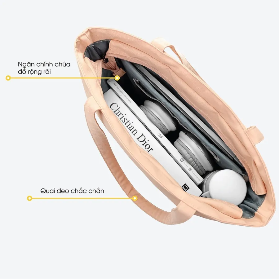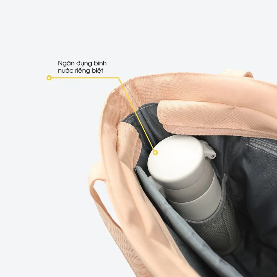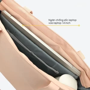 Túi được bố trí nhiều ngăn thông minh, bao gồm ngăn chính rộng rãi, ngăn laptop chống sốc (tối đa ~14 inch), ngăn bình nước và các ngăn phụ tiện lợi giúp bạn sắp xếp đồ dùng cá nhân khoa học hơn.